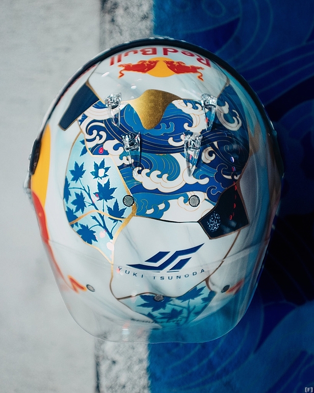 裕毅は、今週末のラスベガスGPではK・ヨシムラ氏がデザインを担当したヘルメットを装着。裕毅のトレードマークでもある「紅葉」に加え、富士山や海をイメージしたイラストも加えられた。