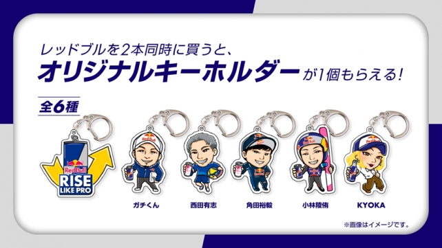 店頭キャンペーンでは、レッドブルを2缶同時購入でオリジナルキーホルダーをプレゼント。キーホルダーは全6種類で、レッドブル/レーシング・ブルズのリザーブ兼テスト・ドライバーを務める角田裕毅のキーホルダーもラインナップしている。